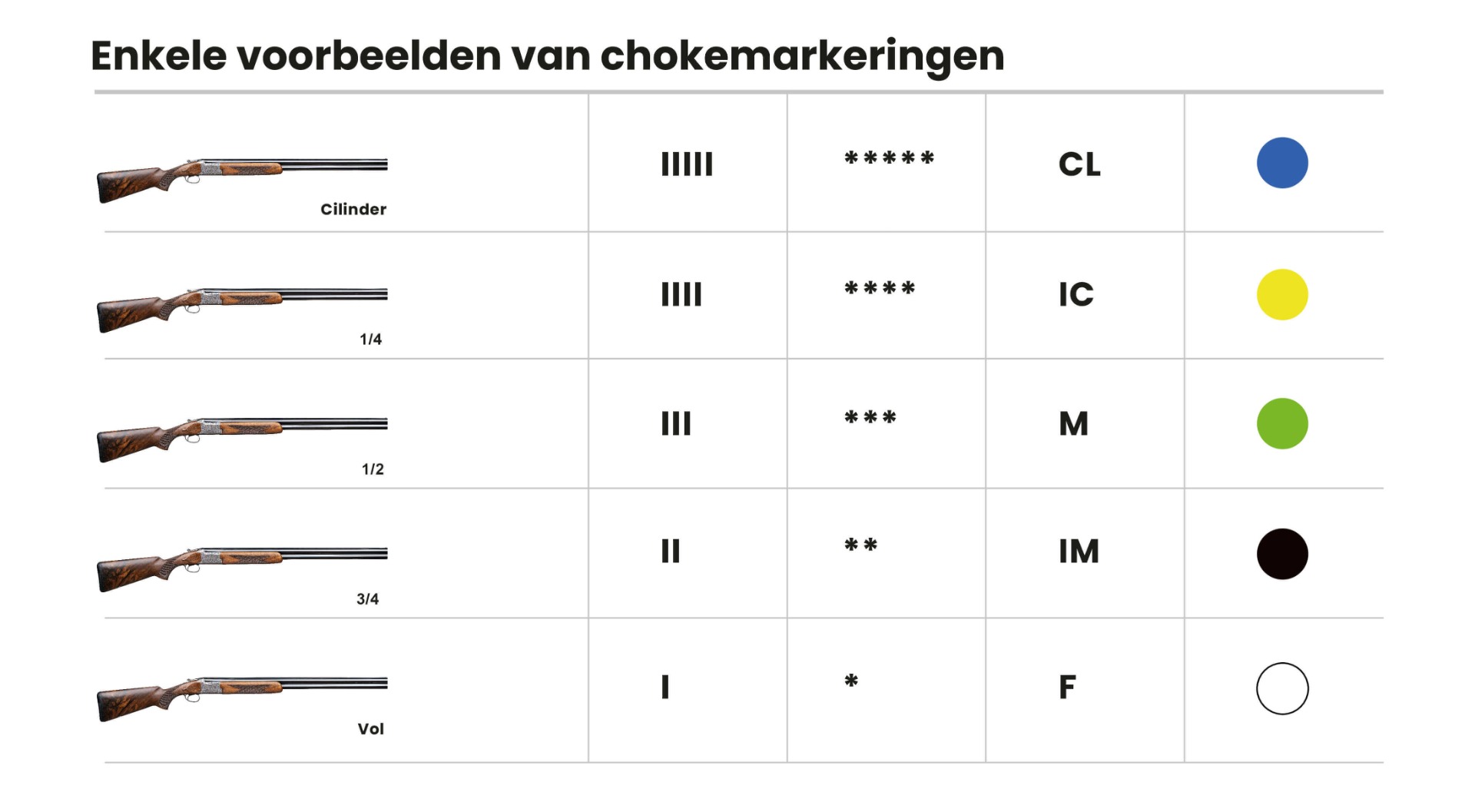 Let wel, bovenstaande gegevens zijn een gemiddelde. Gebruik je krachtiger patronen of langere patronen met een grotere lading of een afwijkend korrelformaat, dan kunnen de schotbeelden afwijken. Dat even als algemene disclaimer, maar we willen straks een speciale vermelding maken voor staalhagel, omdat die tegenwoordig het meest naast lood gebruikt wordt en heel andere karakteristieken vertoont. Voor we daar induiken, eerst nog even een klein inzicht in de choke-aanduidingen. Een choke heeft altijd een markering ter indicatie. Dit verschilt per fabrikant. De één gebruikt kleuren, de andere sterren, inkepingen, letters, et cetera. Hieronder een kleine selectie als voorbeeld: