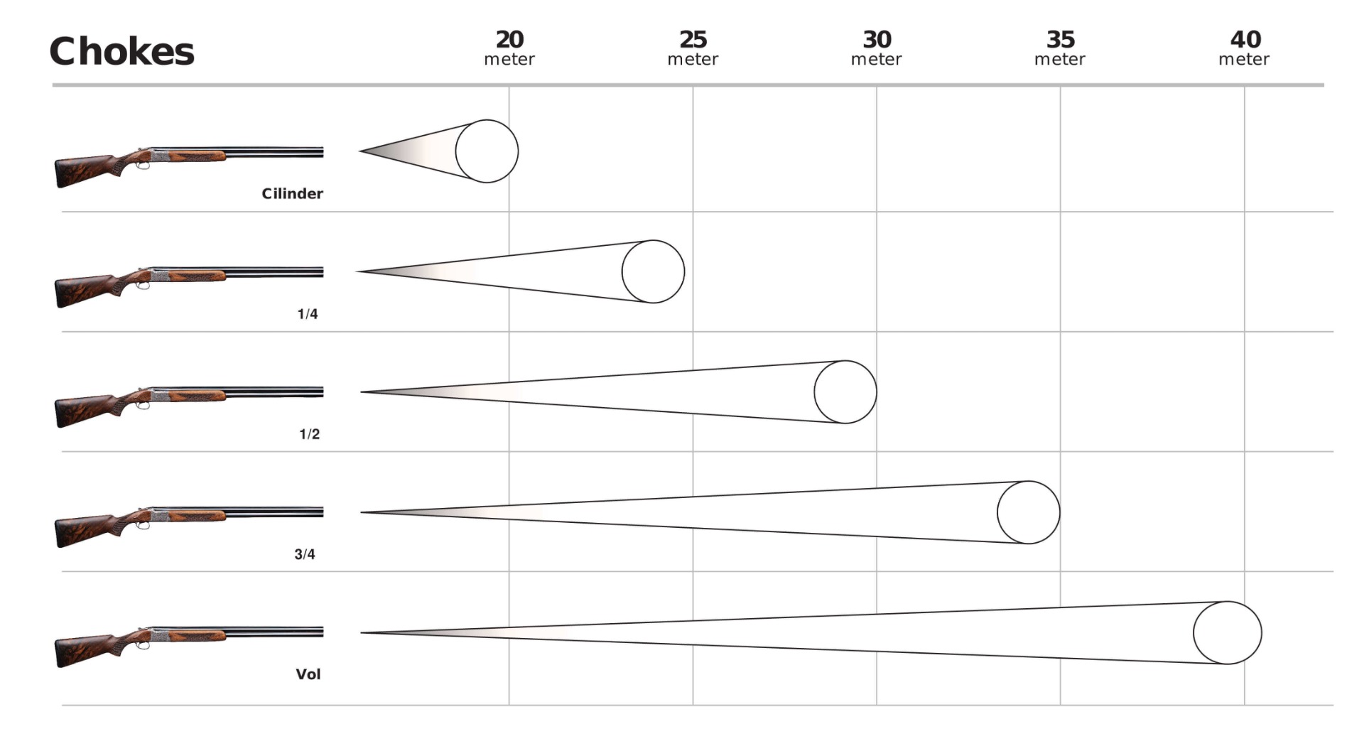 Anders gezegd: de wolk hagel wordt steeds groter, wat in theorie de trefkans vergroot. Maar omdat de hagelkorrels zich steeds verder van elkaar verspreiden, loop je een steeds groter risico alsnog het doel te missen of slechts met enkele hagelkorrels te raken. Om de hagelkorrels op grotere afstand wat dichter bij elkaar te houden -en de dekking dus te vergroten- wordt een choke gebruikt. Een vernauwing in het uiteinde van de loop. Hoe verder het doel is, hoe nauwer de choke moet zijn die je gebruikt.