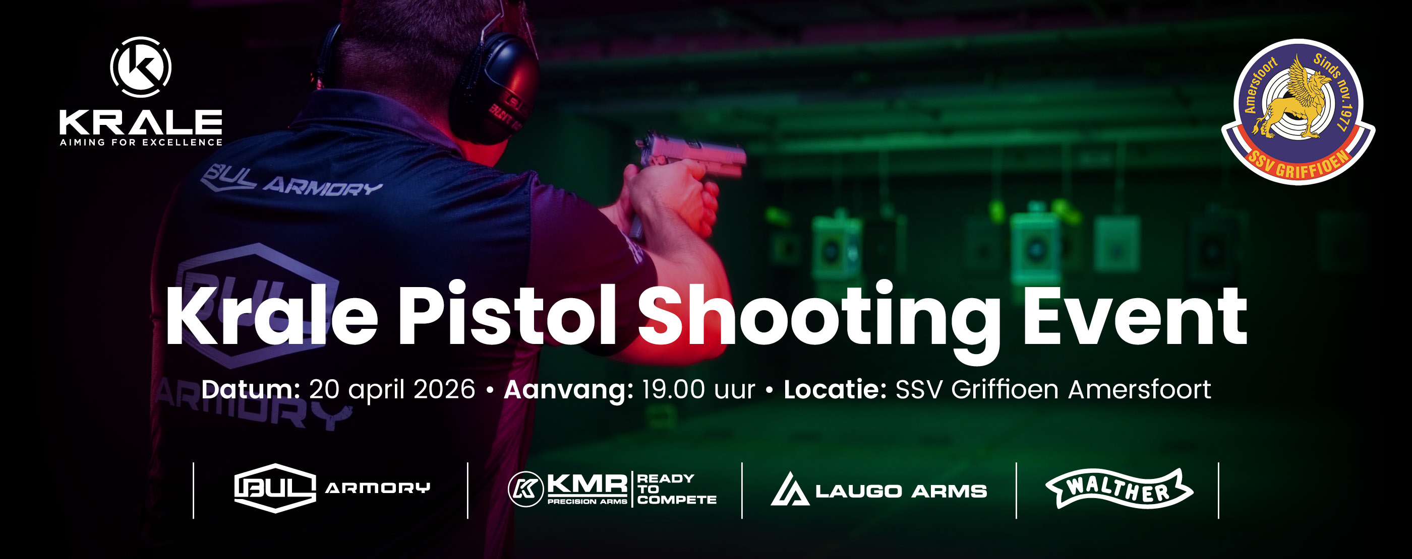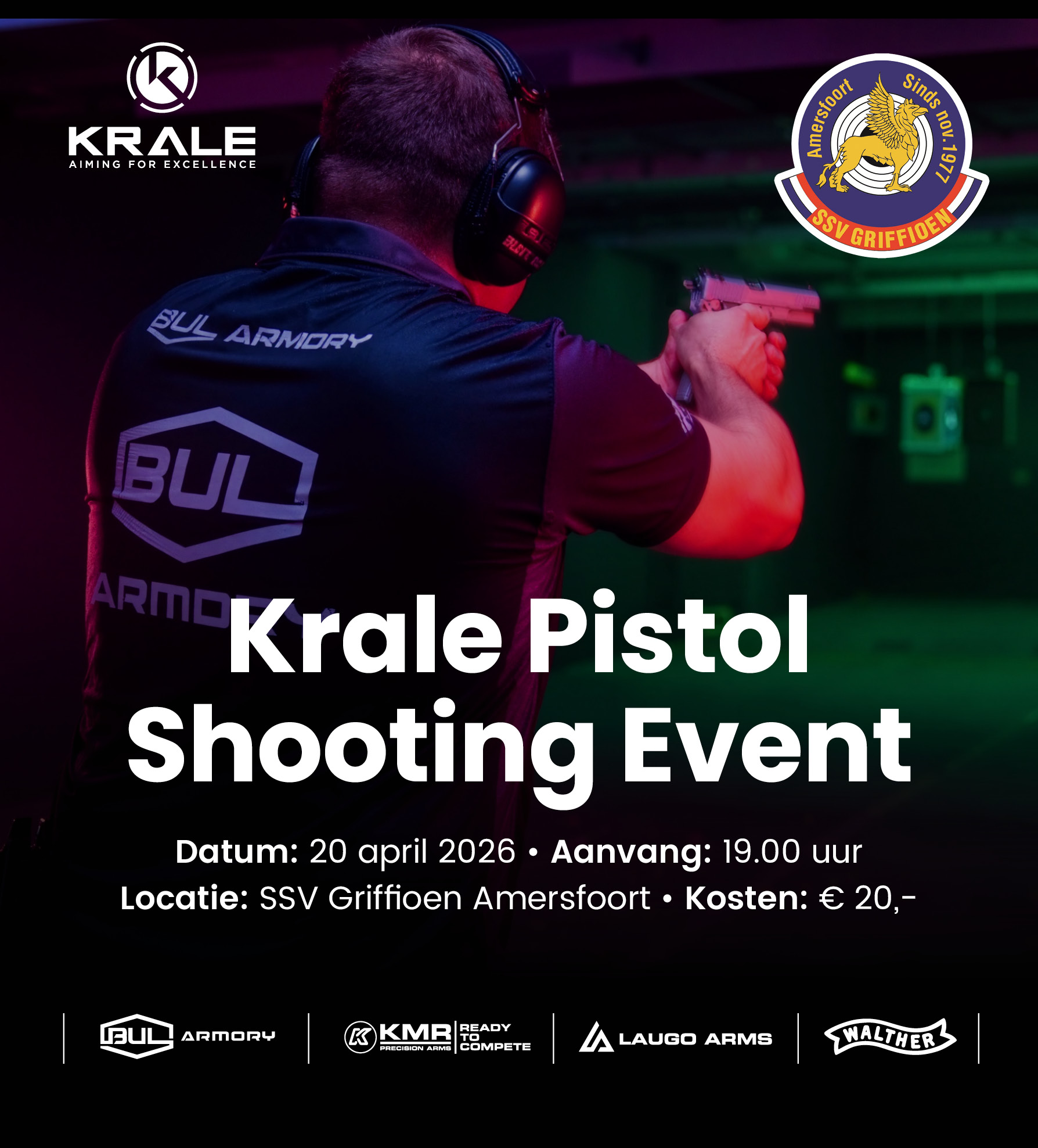 Op maandag 20 april 2026 organiseren we samen met SVV Griffioen een bijzonder schietevent. Tijdens dit event kun je kiezen uit een zorgvuldig geselecteerde reeks handwapens – en ze uiteraard ook uitproberen. Zit het wapen van jouw voorkeur ertussen? Grijp dan deze unieke kans om het uitgebreid te testen.